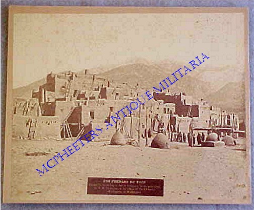 IMPERIAL SIZE CABINET CARD OF LOS PUEBLOS DE TAOS – ca. 1878 IMAGE BY BYRON H. GURNSEY RECORDED BY THE LIBRARY OF CONGRESS:  A very collectable cabinet card in the desirable “Imperial” size, this ca. 1878 view of the Taos Pueblo in New Mexico captures the dwellings before they were altered by increased traffic and later additions.  Featuring the beehive ovens, cedar pole ladders and some of the occupants in their native finery, this image captured one of the most iconic views of the Navajo pueblos.